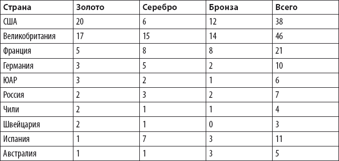 Первые олимпийские теннисные турниры были делом энтузиастов. Теннис как спорт еще не окреп, не было международных олимпийских комитетов, участники добирались до места соревнований и проживали на свои средства. Часто участником становился тот, кто просто был ближе к месту проведения и мог себя содержать во время турнира. Зрителей было мало, в спортивном мире первые игры не имели почти никакого успеха. Несмотря на это, имена первых чемпионов Игр вписаны золотыми буквами в Зале славы тенниса и Олимпийской хронике. 1896 год – первый Олимпийский теннисный турнир. Первыми олимпийскими чемпионами по теннису стали ирландец Джон Пий Боланд (в одиночном и парном разрядах) и немец Фридрих Траун. В 1900 году впервые женщины разыграли свои ко мплекты наград – в женском одиночном разряде и смешанном парном. Шарлотта Купер (Великобритания) стала первой в истории Олимпийских игр обладательницей олимпийского золота в женском теннисе. В 1908 году впервые были проведены два отдельных Олимпийских теннисных турнира, на открытых кортах (в июле) и в помещениях (в мае). 1924 год – «черный» год для олимпийского тенниса, в результате конфликта между МОК и Международной федерацией лаун-тенниса после Игр в Париже теннис был убран из официальной программы Олимпийских игр более чем на 60 лет. В 1968 году впервые за 44 года в программу Олимпиад был включен теннис, но только как показательный вид. В Гвадалахаре и Мехико прошли два отдельных турнира. В 1984 году теннис во второй раз попытался робко пробить себе дорогу – состоялся второй показательный Олимпийский турнир. Возраст участников был ограничен 21 годом, игры проводились только в одиночных разрядах. Победителями этих турниров стали будущие первые ракетки мира Штеффи Граф и Стефан Эдберг. В 1988 году теннис наконец-то вернулся в программу Олимпиад. Турнир проводился в мужском и женском одиночном и парном разрядах. Штеффи Граф выигрывает олимпийское золото и первой в истории завоевывает так называемый Золотой шлем, победив перед этим не только на Олимпиаде, но и на всех четырех турнирах Большого шлема за один сезон. В 2000 году Ассоциация теннисистов-профессионалов впервые начисляет рейтинговые очки за результаты, показанные на Олимпиаде, а в 2012 году в олимпийскую программу возвращены соревнования в смешанном разряде (микст). Достижения наших теннисистов таковы. На Олимпиаде в 1992 году в Ба рселоне наши теннисисты впервые вошли в число призеров: Андрей Черкасов в одиночном разряде и Наталья Зверева и Лейла Месхи в парном разряде стали бронзовыми призерами. Олимпиада 2000 года принесла медали Евгению Кафельникову – он стал чемпионом, а Елена Дементьева завоевала серебряную медаль. На Олимпиаде 2008 года в Пекине настоящий триумф праздновала женская команда России – весь пьедестал в женском теннисе был российским: Елена Дементьева (золото), Динара Сафина (серебро), Вера Звонарева (бронза). Наибольшую же коллекцию золотых олимпийских медалей имеют американки сестры Венус и Серена Уильямс – по четыре медали высшей пробы у каждой в одиночных и парных разрядах. Достижения стран в олимпийском теннисе выглядят так (табл. 8.1).