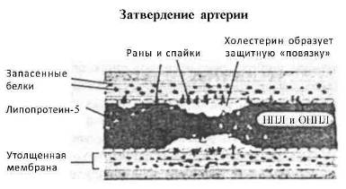 Камни в желчных протоках печени деформируют печеночные дольки, кровеносные сосуды которых передавливаются и запутываются, что ухудшает внутреннее кровоснабжение. Печеночные клетки гибнут, и токсичные продукты их разложения попадают в кровь. Это еще более ослабляет способность печени к детоксикации крови. В результате все больше вредных веществ накапливается в самой печени и в крови. Застой в печени может препятствовать течению крови по венам, приводя к ускорению сердцебиения и даже сердечным приступам. Очевидно также, что токсины, не обезвреженные печенью, наносят вред сердцу и кровеносным сосудам. Другим негативным следствием этого процесса является то, что белки из погибших клеток (а ежесуточно отмирает 30 млрд клеток) и неиспользованные белки из пищи расщепляются недостаточно основательно, что ведет к повышению их концентрации в крови. Чтобы избавиться от них, организм пытается откладывать эти излишки в стенки сосудов (более подробно об этом говорится ниже). Когда для этих запасов уже не хватает места, избыток белков остается в крови. Это может привести к увеличению числа эритроцитов (красных кровяных клеток), что повышает до аномального уровня концентрацию форменных элементов крови в плазме. Растет также и содержание гемоглобина в эритроцитах, отчего краснеет кожа, особенно на лице и груди (гемоглобин — это сложный белок, доставляющий молекулы кислорода из легких в клетки организма). В результате эритроциты увеличиваются в размерах и не могут проходить через крошечные капилляры. Очевидно, что кровь в результате становится слишком густой и движется очень медленно, усугубляя тенденцию к формированию тромбов. Образование кровяных сгустков считается главным фактором риска возникновения инфаркта и инсульта. Поскольку жир не может формировать тромбы, опасность связана прежде всего с повышенной концентрацией белков. Исследования показывают, что содержащая серу аминокислота под названием гомоцистеин способствует образованию крошечных сгустков, которые ведут к закупорке артерий, и гигантских тромбов, становящихся причиной боль-ш и н с т в а Инфарктов и инсультов (Ann Clin & Lab Sci, 1991 и Lancet, 1981). Стоит обратить внимание на то, что гомоцистеин в 40 раз более предсказуем как фактор риска сердечно-сосудистых заболеваний, нежели холестерин. Эта аминокислота образуется в организме в результате нормального обмена метионина, которого много в красном мясе и молочных продуктах. Высокая концентрация белков в крови задерживает подачу в клетки организма таких важных веществ, как вода, глюкоза и кислород. (П р и м е ч а н и е. Переизбыток белков вызывает обезвоживание, т. е. сгущение крови, а это является одной из главных причин высокого кровяного давления и болезней сердца.) Белки также препятствуют полному выведению из организма продуктов обмена (см. раздел «Нарушения кровообращения...»). Все эти факторы вынуждают организм повышать давление крови. Этот процесс до некоторой степени нейтрализует эффект опасного для жизни сгущения крови. Однако эта защитная реакция организма на неестественную для него ситуацию подвергает кровеносные сосуды повышенным нагрузкам и вредит им. Одна из первых и наиболее эффективных мер, принимаемых организмом, чтобы избежать нависающей угрозы инфаркта, заключается в том, чтобы вывести лишние белки из кров