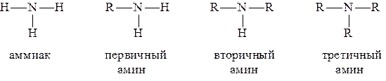 АМИНЫ Аминами называются производные аммиака, в которых один или несколько атомов водорода замещены на углеводородные радикалы. В зависимости от числа углеводородных радикалов различают первичные, вторичные и третичные амины. При этом не имеет значения, какие радикалы (первичные, вторичные или третичные) являются заместителями: