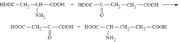 Реакция сводится к взаимопревращению аминогруппы и карбонильной группы под действием ферментов трансаминаз. Эта реакция служит не только для разрушения аминокислот, но и для их биосинтеза. Рассмотрим реакцию взаимопревращения аспарагиновой кислоты и α-кетоглутаровой в щавелевоуксусную и глутаминовую кислоты: