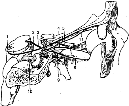 Рис. 128. Преддверно-улитковый нерв (схема): 1 — полукружные каналы; 2 — латеральный ампулярный нерв; 3 — передний ампулярный нерв; 4— эллиптически-мешотчатый нерв; 5— эллиптически-мешотчато-ампулярный нерв; 6— преддверный узел; 7— преддверный нерв; 8 — улитковый нерв; 9 — сферически-мешотчатый нерв; 10 — улитковый узел (спиральный узел улитки); 11— задний ампулярный нерв