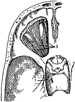 Рис. 126. Отводящий нерв: 1 — отводящий нерв; 2— зрительный нерв; 3 — мышцы глаза