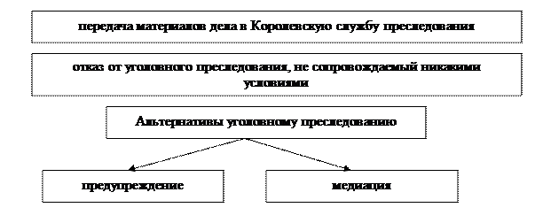 В Англии существует несколько вариантов окончания полицейского расследования.Единственный вариант, когда производство по уголовному делу продолжается – это передача материалов дела в Королевскую службу преследования. К этому варианту полиция прибегает, когда она раскрывает преступление и устанавливает лицо, его совершившее, а также признает целесообразным (с точки зрения публичных интересов) и возможным дальнейшее уголовное преследование указанного лица и не находит оснований для применения альтернативных методов реакции на преступление (предупреждения или медиации). Противоположным вариантом является отказ от уголовного преследования, не сопровождаемый никакими условиями. Он допустим в трех случаях: во-первых, когда уголовное преследование юридически невозможно (в деянии нет состава преступления, лицо не достигло возраста уголовной ответственности, истек срок давности привлечения к уголовной ответственности и т. д.); во-вторых, когда уголовное преследование фактически невозможно (преступление не удалось раскрыть или же полиция не смогла собрать достаточные доказательства виновности определенного лица в его совершении); в-третьих, когда полиция, раскрыв преступление и установив подлежащее уголовному преследованию лицо, считает, тем не менее, нецелесообразным его привлечение к уголовной ответственности. В последнем случае она попросту не передает дело в суд или королевскому преследователю. Решение полиции об отказе от уголовного преследования не подлежит какому-либо процессуальному контролю ни со стороны суда, ни со стороны Королевской службы уголовного преследования. Альтернативы уголовному преследованию применительно к мелкой преступности в Англии. Институты: предупреждение (caution) и медиация (mediation). Существует три разновидности института предупреждения. В первом случае полицейский, обнаружив факт совершения незначительного преступления и не считая необходимым возбуждать уголовное преследование, только предупреждает несовершеннолетнего о недопустимости подобных действий, не предпринимая при этом никаких иных мер. Такой вариант именуется «неформальным предупреждением» (informal warning), юридического значения он не имеет, так как не влечет никаких процессуальных последствий. Фактически - это простой и ничем не обусловленный отказ в возбуждении уголовного преследования. Во втором случае предупреждение заносится в протокол, поэтому такая мера называется «формальным предупреждением» (formal warning). В остальном она мало, чем отличается от первого варианта предупреждения, ибо указанный протокол процессуальным актом также не является (на него нельзя ссылаться в суде даже в случае рецидива). Третьей разновидностью является «официальное предупреждение» (official caution), которое в отличие от первых двух представляет собой реальную правовую альтернативу уголовному преследованию. Полиция, не желая оставлять преступление без последствий и не считая необходимым возбуждать традиционное уголовное преследование, официально предупреждает несовершеннолетнего под расписку его родителей. Такое предупреждение заносится в специальный реестр, находящийся в архивах полиции. В случае совершения лицом нового преступления, когда уголовное преследование становится фактически неизбежным, рассматривающий дело суд ставит