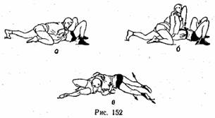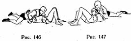 Условия. Противник лежит на спине, атакующий находится со стороны его головы на коленях. Проведение. Прижимаясь грудью к груди противника, разведя широко в стороны ноги, атакующий захватывает руки противника под плечи или в сгиб локтя (может одновременно захватить свой пояс или пояс противника) (рис. 146).