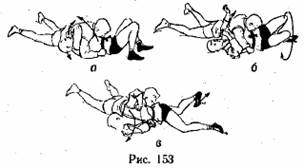 Варианты. 1. С захватом рук (рис. 147). 2. С захватом пояса (рис. 148). 3. Обратное удержание со стороны головы (рис. 149). Защиты. 1. Отталкивая руками и ногами противника, не дать ему прижаться грудью к груди. 2. Отжать голову руками (рукой). Уходы. 1. Вращением в сторону захватом пояса (рис. 150). 2. Вращением в сторону захватом руки (рис. 151). 3. Отжимая голову (рис. 152). 4. Выведением рук в одну сторону, выкручиваясь (рис. 153). Ответный прием. Удержание со стороны головы после ухода вращением.