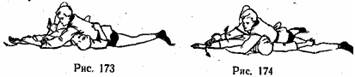 Условия. Проводящий прием проводит удержание верхом. Противник упирается в его плечи, отжимая от себя. Проведение. Проводя одну руку между рук противника, движением вперед-наружу- к себе захватить предплечье его руки под свое плечо. Подводя одновременно предплечье под нижнюю часть плеча, согнуть руку противника к себе-внутрь. Свободной рукой упереться в одноименный плечевой сустав противника, а другой рукой из-под плеча захватить предплечье своей свободной руки. Упираясь рукой в плечо и немного прогибаясь, разгибать руку противника и проводить прием до сигнала (рис. 169). Варианты. 1. От удержания со стороны ног. 2. Снизу (рис. 170). 3. От удержания со стороны головы (рис. 171). 4. От удержания со стороны головы, перенося ногу через туловище (рис. 172). Защиты. 1. Сгибая руку на себя, толчком свободной руки вывести локоть из захвата ниже предплечья. 2. Соединить руки сзади туловища проводящего прием.