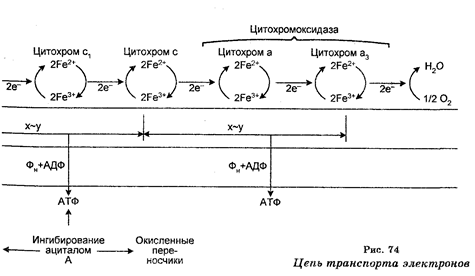 В результате четырех окислительно-восстановительных реакций цикла Кребса происходит перенос трех пар электронов над НАД и одной пары электронов на ФАД. Восстановленные этим путем переносчики электронов НАД и ФАД подвергаются затем окислению уже в цепи переноса электронов, в результате которого генерируется одиннадцать молекул АТФ. Одна высокоэнергетическая связь генерируется непосредственно в цикле Кребса. Таким образом, на каждый двухуглеродный фрагмент, полностью окисляемый до Н2О и СО2, генерируется двенадцать высокоэнергетических фосфатных связей. Цикл Кребса подвержен регуляции; его скорость зависит от потребности в АТФ других метаболических реакций. Важное значение имеет регуляция синтеза цитратсинтазы, изоцитратдегидроге-назы и оксоглутаратдегидрогеназы. Биологическое значение цикла Кребса заключается не только в том, что он является завершающим этапом в генерировании энергии, но и в том, что он «поставляет» промежуточные продукты для биосинтеза. Цикл Кребса действует только в аэробных условиях по той причине, что для него необходимы НАД и ФАД, регенерирование которых происходит при переносе электронов НАД×Н и ФАД×H2 на О2 по цепи транспорта электронов, сопровождаемом одновременным образованием АТФ (рис. 74). Поскольку у аэробных организмов единственным акцептором электронов является О2, а электроны не переносятся от топливных молекул и продуктов их реакций прямо на O2, топливные молекулы и продукты их распада переносят электроны к пиримидиннуклеотидам или флавинам, являющимся переносчиками. Главным акцептором электронов при окислении топливных молекул является никотинамидадениндинуклеотид (НАД+, реакционноспособной частью которого является никотинамидное кольцо. Последнее присоединяет ион водорода и два электрона. Восстановленной формой этого переносчика является НАД×Н. Окисление последнего дает три молекулы АТФ. Вторым акцептором электронов является ФАД (флавинадениндинуклеотид), ре-акционноспособной частью которого является изоаллоксазиновое кольцо, которое тоже присоединяет два электрона. Восстановленной формой ФАД является ФАД×H2. Окисление последнего дает две молекулы АТФ. Таким образом, главными переносчиками являются НАД×Н и ФАД-Hg, которые содержат по паре электронов с высоким потенциалом и которые доставляют свои высокоэнергетические электроны к О3 по цепи транспорта электронов, также локализованной в митохондриях. Этот перенос сопровождается образованием АТФ из АДФ и пи-рофосфата (Рi), происходит на митохондриальных мембранах и носит название окислительного фосфорилирования. Оно было открыто в 1931 г. В. А. Энгельгардтом (1894-1984). Следовательно, окислительное фосфорилирование — это процесс образования АТФ, сопряженного с переносом электронов по цепи транспорта (переносчиков) от НАД×Н или ФАД×H2 к O2 через многие другие переносчики, в частности питохромы. В процессе окислительного фосфорилирования генерируется 32 молекулы АТФ из всех 36 молекул АТФ, генерируемых в процессе окисления глюкозы до СО2 и Н2О. Многоступенчатость транспорта электронов от НАД×Н или ФАД×Н2 к О2 по цепи многочисленных переносчиков сопровождается выбросом протонов из митохондриального матрикса и генерированием на внутренней митохондриальной мембране протон-движущей силы (мембранного потенциала), измеряем