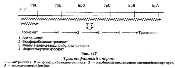 Однако возможна и позитивная регуляция лактозного оперона. Если вслед за индуктором в среду, где выращены бактерии,прибавить глюкозу, то наступает катаболитная репрессия (3-галак-тозидазы, сопровождающаяся снижением уровня цАМФ. Если же в культуру прибавить экзогенный цАМФ, то катаболитическая репрессия снимается и лактозный оперон будет функционировать нормально. Таким образом, цАМФ является позитивным регулятором (регуляция происходит в присутствии индуктора). Примером биосинтезирующего оперона является триптофановый оперон, который состоит из 5 генов trpE, D, С, В и А, кодирующих ферменты, участвующие в биосинтезе триптофана (рис. 147). Первая химическая реакция, характерная для синтеза триптофана (как и для тирозина и фенилаланина), заключается в конденсации (накоплении) эритрозы-4-Ф и фосфоенолпирувата, необходимых для образования З-дезокси-арабино-гептулозоната-7-Ф (ДДГФ), катализируемого ДАГФ-синтетазой. Образующийся продукт (хоризмат) с помощью ферментов превращается в триптофан. Экспрессия этого оперона находится под негативным контролем репрессора, являющегося продуктом гена trp R. Репрессия конечным продуктом (трип-тофаном) заключается в том, что неактивный в свободном состоянии репрессор не мешает переходу РНК-полимеразы к промотору, т. е. не мешает транскрипции мРНК. Репрессор становится активным в результате связывания с конечным продуктом (триптофаном). Когда комплекс репрессор + триптофан связывает оператор, то это предупреждает преход РНК-полимеразы к промоторам, т. е. подавляет синтез мРНК. Более тонкий механизм заключается в том, что продукт гена trp R (репрессор) ингибирует синтез одной из ДАГФ-синтетаз, в частности, синтетазу АгоН, путем ингибирования ее мРНК, а следовательно, ингибирует и мРНК всего гистидинового оперона.