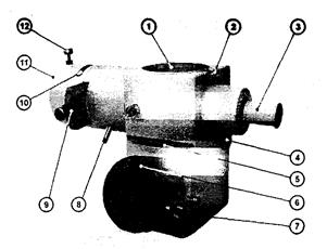 Рисунок 5 Тубус 1-гнездо для устновки револьвера с объективами или для модуля ДИК, 2-винт крепления револьвера или модуля ДИК, 3-рукоятка отражателя «Светлого поля», 4-винт крепления тубуса на штативе, 5- паз для поляфильтра-анализатора или заглушки «темного поля» или заглушки «светлого поля», 6- видеоадаптер, 7-винт для крепления видеонасадки, 8-рукоятка ирисовой диафрагмы, 9 - направляющая для смены методов исследования объектов в светлом и темном поле; 10 - паз для установки светофильтра или поляфильтра-поляризатора; 11 - гнездо для установки фонаря, 12 - винт крепления фонаря