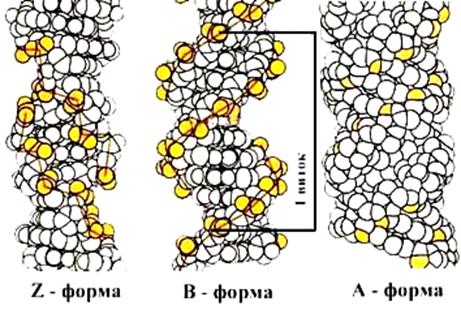 Согласно трехмерной модели, предложенной Уотсоном и Криком, сахаро-фосфатный остов располагается по периферии двойной спирали, а азотистые основания находятся внутри, и их плоскости перпендикулярны оси спирали. Между основаниями образуются специфические водородные связи, в результате чего осуществляется так называемое уотсон-криковское спаривание. Аденин всегда образует две водородные связи с тимином, а гуанин образует три водородные связи с цитозином. Таким образом, более объемные пурины всегда спариваются с пиримидинами, имеющими меньшие размеры. Это приводит к тому, что расстояния между С1'-атомами дезоксирибозы в двух цепях оказываются одинаковыми для АТ- и GC-пар и равными 1,085 нм. В результате АТ- и GС-пары включаются в двойную спираль без какого-либо заметного изменения геометрии остова. Диаметр двойной спирали равен примерно 2,0 нм. В двойной спирали ДНК образуются желобки. Это связано с тем, что сахарофосфатный остов расположен дальше от оси спирали, чем основания. В двойной спирали имеются два желобка-большой и малый. Стабильность двойной спирали обусловлена разными взаимодействиями. Отчасти за нее ответственны водородные связи между основаниями. Однако, по-видимому, более важную роль играет межплоскостное взаимодействие-стэкинг. При этом обеспечиваются не только выгодные вандер-ваальсовы контакты между атомами, но и возникает дополнительная стабилизация благодаря перекрыванию p-орбиталей атомов контактирующих оснований. Стабилизация осуществляется также за счет благоприятного гидрофобного эффекта, проявляющегося в том, что неполярные основания защищены от непосредственного контакта с растворителем. Напротив, сахарофосфатный остов с его полярными группами и заряженными атомами экспонирован, что также стабилизирует структуру. Для вторичной структуры характерно явление полиморфизма ДНК. Изменение физиологических условий приводит к переходу одной формы (конформации) ДНК в другую, что позволяет дополнительно регулировать работу генов. Т.о. полиморфизм ДНК -это способность двойной спирали принимать различные конформации. Рентгеноструктурные исследования кристаллов полинуклеотидов выявили четыре основных типа структур – А-, В-С- и Z-формы ДНК (рис.1.5).