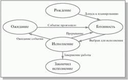 При рождении процесс получает в свое распоряжение адресное пространство, в которое загружается программный код процесса; ему выделяются стек и системные ресурсы; устанавливается начальное значение программного счетчика этого процесса и т. д. Родившийся процесс переводится в состояние готовность. Готовность — пассивное состояние процесса. Он заблокирован в связи с внешними по отношению к нему обстоятельствами: процесс имеет все требуемые для него ресурсы, он готов выполняться, однако процессор занят выполнением другого процесса. ОС, пользуясь каким-либо алгоритмом планирования, выбирает один из готовых процессов и переводит его в состояние исполнение. Исполнение - активное состояние процесса, во время которого процесс обладает всеми необходимыми ресурсами и непосредственно выполняется процессором. В состоянии исполнения происходит выполнение кода процесса. Выйти из этого состояния процесс может по трем причинам: • операционная система прекращает его деятельность; • он не может продолжать свою работу, пока не произойдет некоторое событие, и операционная система переводит его в состояние ожидание. Ожидание – пассивное состояние процесса, процесс заблокирован, он не может выполняться по своим внутренним причинам, он ждет осуществления некоторого события. Процесс попадает в состояние готовность после того, как ожидаемое событие произошло; • в результате возникновения прерывания в вычислительной системе (например, прерывания от таймера по истечении предусмотренного времени выполнения) его возвращают в состояние готовность. При завершении своей деятельности процесс из состояния исполнение попадает в состояние закончил исполнение. Виртуальная память процесса – технология управления памятью ЭВМ, разработанная для многозадачных операционных систем Распределение памяти между процессами: • Cтраничное – виртуальное адресное пространство каждого процесса делится на части одинакового, фиксированного для данной системы размера, называемые виртуальными страницами. Вся оперативная память машины также делится на части такого же размера, называемые физическими страницами (или блоками). Размер страницы обычно выбирается равным степени двойки: 512, 1024 и т.д., это позволяет упростить механизм преобразования адресов. При загрузке процесса часть его виртуальных страниц помещается в оперативную память, а остальные - на диск. Смежные виртуальные страницы не обязательно располагаются в смежных физических страницах. При загрузке операционная система создает для каждого процесса информационную структуру – таблицу страниц, в которой устанавливается соответствие между номерами виртуальных и физических страниц для страниц, загруженных в оперативную память, или делается отметка о том, что виртуальная страница выгружена на диск. При активизации очередного процесса в специальный регистр процессора загружается адрес таблицы страниц данного процесса. При каждом обращении к памяти происходит чтение из таблицы страниц информации о виртуальной странице, к которой произошло обращение. На производительность системы со страничной организацией памяти влияют временные затраты, связанные с обработкой страничных прерываний и преобразованием виртуального адреса в физический. • Сегментное – позволяет дифференцировать спо