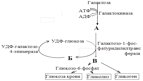 На схеме метаболизма галактозы расставьте указанные метаболиты: Б В А Галактозо-1-фосфат Глюкозо-1-фосфат УДФ-галактоза