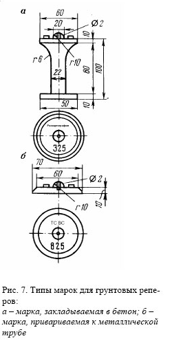 б) Стенные и скальные реперы. В стены искусственных сооружений, зданий и вертикальную поверхность скалы закладывают стенные реперы типа 143 (рис. 13). При изготовлении стенного репера и марок (рис. 13) на знаках отливают начальные буквы названия организации, выполнявшей нивелирование, и номер репера. Стенной репер, приведенный на рис.13 закладывают на линиях нивелирования III и IV классов.