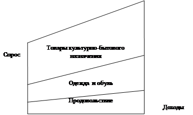 Тесноту связи между спросом и доходами населения также можно оценить при помощи коэффициента эластичности. В основном эластичность спроса положительна, т. е. с ростом доходов происходит повышение спроса. Измерив эластичность по доходу, можно определить, относится ли данный товар к категории “нормальных” (когда рост доходов приводит к росту спроса) или “низших” (когда реакция обратная). Основная масса потребительских товаров относится к категории “нормальных”. С ростом доходов мы больше покупаем одежды и обуви, высококачественных продуктов питания, товаров длительного пользования. Однако есть товары, спрос на которые обратно пропорционален доходам потребителей. Сюда относится вся продукция “Second hand”, некоторые виды продовольствия (крупы, сахар, хлеб и т.п.). Таким образом, с ростом или снижением доходов обязательно меняется и распределение доходов на различные цели. При этом между ростом доходов и ростом потребления нет прямопропорциональной зависимости из-за роста сбережений. Закономерность распределения дохода по важнейшим товарным группам отражает закон Энгеля, суть которого сводится к тому, что с повышением доходов растут и расходы по всем товарным группам, но неравномерно. Менее всего в абсолютной сумме растут расходы на питание (рис. 13).
