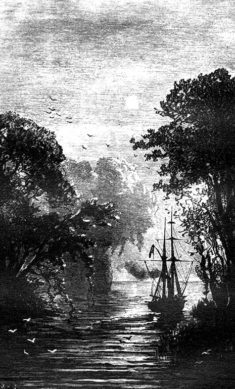 После мыса Фроуорд, между полуостровом Брансуик и островом Десоласьон, пролив суживается. Этот длинный остров вытянулся среди множества мелких островков, напоминая колоссального кита, выброшенного на усеянный валунами берег. Как не похож этот изрезанный конец Американского материка на ровные, правильные оконечности Африки, Австралии и Индии! Какая неведомая катастрофа искрошила этот огромный мыс, брошенный между двух океанов! Далее вместо плодородного побережья протянулись пустынные, дикие берега, изрезанные запутанным лабиринтом узких проток. «Дункан» неуклонно и безошибочно шел этими капризными извилинами, смешивая столбы дыма из своих труб с туманом, сквозь который порой проглядывали скалы. Не замедляя хода, яхта прошла мимо нескольких испанских факторий, обосновавшихся на этих безлюдных берегах. Затем пролив снова расширяется. «Дункан», обойдя крутые берега островов Нарборо, приблизился к южному побережью. Наконец, через тридцать шесть часов после входа в пролив, на «Дункане» увидели скалу мыса Пилар на самой окраине острова Десоласьон. Огромное, просторное, сверкающее море простиралось перед форштевнем «Дункана». И Жак Паганель, приветствуя море восторженным жестом, был взволнован не менее, чем сам Магеллан, когда его корабль «Тринидад» накренился под ветром Тихого океана.
