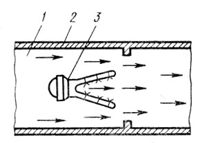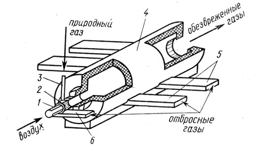 Достаточно большое развитие в отечественной практике нейтрализации вредных примесей, содержащихся в вентиляционных и других выбросах, имеет высокотемпературное дожигание (термическая нейтрализация). Для осуществления дожигании (реакций окисления) необходимо поддержание высоких температур очищаемого газа и наличие достаточного количества кислорода. Выбор схемы дожигания зависит от температуры и количества выбросов, а также от содержания в них вредных примесей, кислорода и других компонентов. Если выбросные газы имеют высокую температуру, процесс дожигания происходит в камере с подмешиванием свежего воздуха. Так, например, происходит дожигание оксида углерода в газах, удаляемых системой вентиляции от электродуговых плавильных печей, дожигание продуктов неполного сгорания (СО и СХНУ) автомобильного двигателя непосредственно на выходе из цилиндров в условиях добавки избыточного воздуха. Если температура выбросов недостаточна для протекания окислительных процессов, то в потоке отходящих газов сжигают природный или какой-либо другой высококалорийный газ. Одним из простейших устройств, используемых для огневого обезвреживания технологических и вентиляционных выбросов, является горелка, предназначенная для сжигания природного газа (рис. 6). Обезвреживаемые выбросы в этом случае подаются в канал 1, где они омывают горелку 2. Из коллектора 3 газ, служащий топливом, поступает в сопла, при истечении из которых инжектируется первичный воздух из окружающей среды. Горение смеси газа с первичным воздухом осуществляется в V-образной полости коллектора. Процесс догорания происходит на выходе из полости, где хвостовая часть факела контактирует с обезвреживаемыми выбросами при их истечении из кольцевой щели между корпусом горелки и коллектора.
