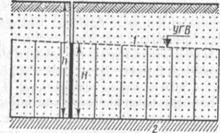 Рис. 24. Элементы грунтовой воды: г h – мощность водопроницаемых слоев; Н – мощность водоносного горизонта; 1 – уровень грунтовой воды; 2 – водоупорное ложе