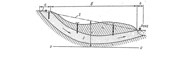 Рис. 28. Артезианский бассейн. Области: а – питания напорных вод; б – напора; в – разгрузки; 1 – уровень грунтовых вод; 2 – пьезометрический уровень напор- ныхзвод; 3 – водоносный напорный пласт; 4 – водоупоры; 5 – скважины; Н – величина пьезометрического напора