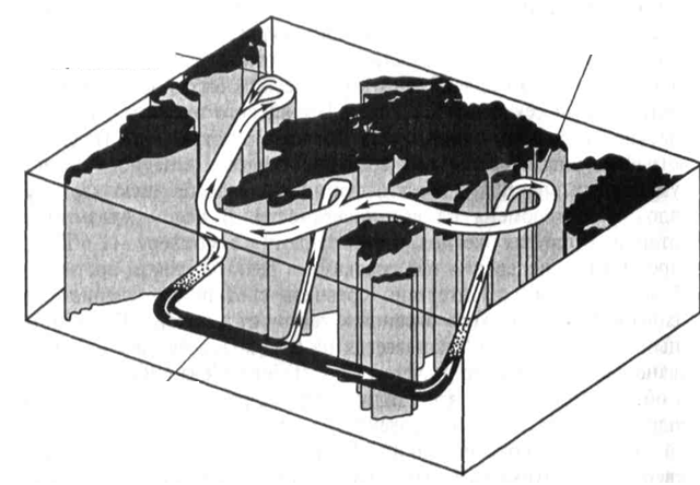 Вплоть до недавнего времени считалось, что в глубинных слоях океана отсутствует изменчивость характеристик водных масс. Однако в 1990-х годах были обнаружены значимые климатические изменения температурно- соленостных характеристик на промежуточных и придонных горизонтах, коле- бания переносов теплоты океанскими течениями в умеренных широтах. На- пример, наблюдается климатически значимое постоянное охлаждение и рас- преснение глубинных слоев Северной Атлантики на протяжении 1970–1990-х гг., сменившееся к началу XXI в. фазой потепления. Оказалось, что на этот процесс оказывают воздействие колебания атмосферного давления в северной части Атлантики – так называемое Северо-Атлантическое колебание. Индекс этого колебания тем выше, чем больше разница давлений между Азорским максиму- мом и Исландским минимумом. При большой величине индекса усиливается западный перенос в атмосфере умеренных широт, интенсивность циклонов в области формирования глубинных вод, глубина конвекции, объем вновь обра- зующейся глубинной воды, меридиональный перенос теплоты в средних широ- тах Атлантики, малые значения индекса замедляют все эти процессы. Таким образом, условия на поверхности океана не только влияют на ха- рактеристики теплообмена с атмосферой, но и на глубинные воды, а значит, и на весь «межокеанский конвейер». Поскольку движение вод у дна океана про- исходит очень медленно, климатический сигнал в виде аномалии температуры и солености из Северной Атлантики распространяется в нижнем звене «гло- бального конвейера» за многие сотни и даже тысячи лет. Анализ подобных природных феноменов дает ключ к пониманию меха- низма воздействия океана на климат: холодные воды Северной Атлантики кон- тролируют количество теплоты в атмосфере над средними и высокими широ- тами Северного полушария. Поэтому информация о состоянии «океанского конвейера» даст возможность определить современное состояние климата и тенденции его развития