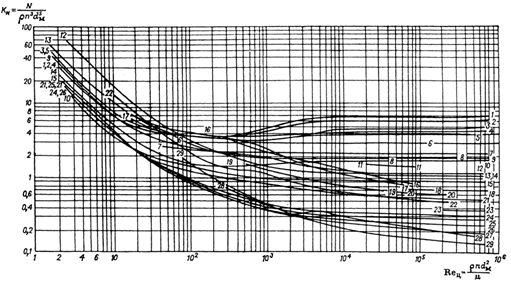 Рисунок 3.1 – Графическая зависимость KN=f(Re) для различных типов мешалок.