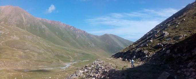 Мы въехали в Боомское ущелье, идеально выстланный китайцами асфальт делал переезд комфортным, но в тоже время имел «убаюкивающий» эффект. Мне жутко хотелось «придавить хорька». Пассажиры на задних рядах без зазрения совести занимались этим уже не первый час. Но тяжелее всего было Роме, за его «покер фэйсом» пряталась дикая усталость. Но ехать было еще далеко, мы должны были успеть к завтраку в поселок Тамчи. Подъезжая к Балыкчи, я уже начал «кивать» и уходить в «сонное измерение». Рома пару раз одергивал меня и предлагал поговорить с ним, чтобы не уснуть самому, да и как-то скучно крутить баранку столько времени. Так и прошли эти долгие 8 часов утомительной дороги. Мы, наконец-таки добрались до места дислокации. Нас встретила администратор Анна, которая заботилась о нашем комфортном пребывании в пансионате «Гостевой дом» последующие четыре дня. Разложив вещи в номере, мы спустились на завтрак. Кормят здесь вкусно и по-домашнему. После завтрака мы улеглись поспать, сон был чутким ввиду огромного количества постояльцев с маленькими детьми и длился не больше 2 часов. Мы приехали сюда отдыхать, а не спать. Да и отдых у нас не совсем обычный, никак не связанный с водными процедурами и алко пати. Сразу после обеда мы собрались на вело тренировку. Облачившись, в голубые цвета формы Astana Pro Team мы с гордым, как могло показаться, видом выехали из пансионата. Рома уже не первый раз катается в этих местах, поэтому он выбирал маршрут. Первый выезд сделали в ущелье Чон Сары-Ой, ведущее к долине Чон Кемин. До одноименного поселка Чон Сары-Ой доехали на машине, припарковали её возле мечети. Дальше пересели на велосипеды и поехали вверх по ущелью. Эти места не защищены от палящего солнца, ни одного деревца на протяжении всего пути. Погода стояла безветренная, лишь слабое напоминание облаков просвечивалось на небосводе. Подстилающая поверхность напоминала начало подъема на Бартогайском марафоне, рыхлая почва и камни. Приходилось все время лавировать между камнями, выбирая наиболее удобную траекторию. Мы ехали около часа до начала основного подъема. К горам нужно относиться с уважением, не без тени иронии Рома вымолвил: «Чина, поздоровайся с мистером серпантином». Эта фраза ознаменовала следующий этап подъема, состоявший из 10 серпантинов. Каждый, из которых высасывал из нас крупицы сил и энергии. Если оглянуться назад, то отсюда открывается панорамный вид на Иссык Куль. Словно оазис в пустыне, он казался призрачным и далеким. В нашем деле главное не заголодать, а то крутить будет нечем. Ехали мы на легких передачах, оттачивая высокий каденс. У меня был с собой кэмелбэк - питьевая система, встроенная в небольшой рюкзак. Во время длительных поездок я обычно развожу изотонический напиток, чтобы восполнять водно-солевой баланс в организме. Растительность в этих краях достаточно скудная. Редкие кустарники и каменные глыбы, вырастающие прямо из зеленого ковра альпийских лугов.