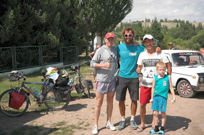 Наш путь пролегал как раз вдоль южного берега, который радовал глаз открывающимися видами. Справа от нас вырастали песчаные грибы разного цвета, такого рода природные ландшафты я уже видел в районе гор Богуты, к востоку от Алматы. В отличии от северного берега, который был несколько бедным на растительность, здесь больше внимания уделяют озеленению, высаживают различные сельскохозяйственные культуры. Мы сделали остановку в одном из поселков вдоль трассы, чтобы купить тандырных лепешек, дети, да и взрослые уже проголодались. Пока Алина и Аня пошли покупать мучные изделия, наш пристальный взгляд остановился на «припаркованных» возле киоска велосипедах с вело багажниками. Нас заинтересовало, кто же счастливые обладатели этих двухколесных транспортных средств. На обочине стоял лохматый чувак с бородой, в синей футболке и шортах. На груди была эмблемка Strametz Traisen и сайт www.sportstrametz.at. Было понятно, что он иностранец. Почему-то тогда сразу не задумался о его возрасте, но если бы вы его увидели где-нибудь на трассе, то ни за что бы не догадались, что ему 27 лет отродясь. Массивная борода и взъерошенный лохматый вид придавали ему брутальности и +10 лет к паспорту. Хотя не брился всего-то семь месяцев. Он охотно поделился с нами со своей историей. Зовут его Niko. Родом он из Австрии. Это уже далеко не первое вело путешествие в чужих краях. В 13 лет он объехал всю Италию. Где-то полтора года назад они вместе с отцом и другом перуанцем выехали из Европы и направились колесить по свету. К этому моменту, он уже затруднялся точно ответить, они проехали около 20 стран. Я перечислю лишь некоторые из них: Хорватия, Словения, Сербия, Болгария, Турция, Иран, Туркменистан, Таджикистан, Узбекистан и вот он в Киргизии. В общей сложности он перевалил за отметку 10 000 км автономного путешествия. Жили они в палатке, которую везли с собой, питались больше как вегетарианцы. Эти суровые парни едут и в снег и в дождь, такая уж участь у путешественников. Два месяца по снежной Европе на велосипеде в мороз и стужу не убавили их пыла. Их путь пролегал через горные страны, они проехали Памир, прошли через суровые горные перевали и многие человеческие лишения. Когда я спросил, какова же цель этого на первый взгляд безумного путешествия вдали от дома, он с улыбкой ответил: «Just for fun». Ох уж этот австрийский юмор. Сейчас они искали машину с прицепом и направлялись в Бишкек. Там их дороги расходятся: отец летит домой в Австрию, друг Перуанец на работу в Стамбул, а сам Niko едет напрямик в Алмату. Ему интересна наша страна, и он спешит ее увидеть. Он не поехал через Китай и Россию в виду того, что гражданам Австрии тяжело получить туда визу. Дальнейшие его планы это снова дорога на юг – волшебный Тайланд. Интересный получился диалог, если вас заинтересовало его путешествие, и вы хотите узнать о нем больше информации, то вы можете зайти на его сайт: www.niko-rides.com. Ну а мы сделали с ним фото на память и поехали дальше.