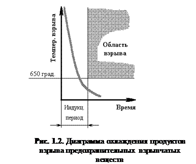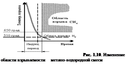 При наличии холодных поверхностей на пути движения взрывной волны скорость ее распространения падает, препятствия (сужения выработок, повороты, предметы и т.д.), способствуя повышению давления, вызывают ее увеличение. Скорость взрывной волны может увеличиться от нескольких десятков до нескольких сотен метров в секунду. Взрыв метана сопровождается возникновением двух взрывных волн (ударов). Прямая волна от источника воспламенения распространяется к периферии, обратная - к центру взрыва вследствие возникающего там разрежения из-за охлаждения продуктов взрыва и конденсации образующихся при взрыве паров влаги на холодных стенках выработки. Обратная волна гораздо слабее прямой волны. Однако она довершает те разрушения, которые начала прямая волна. Водород - легкий газ без цвета и запаха с плотностью по отношению к воздуху 0,069, т.е. он почти в 20 раз легче воздуха. Выделяется в качестве спутника метана в калийных рудниках Урала, Белоруссии, Германии, Канады и в выработках, пройденных по нефтеносным породам, в помещениях, где производится зарядка аккумуляторных батарей, в рудниках АО «Апатит», в полиметаллических рудниках Северного Кавказа, в рудниках Норильска, при разработках золотоносных месторождений Забайкалья, Урала и Западной Сибири, в железорудных рудниках Якутии (Республика Саха). Водород горит над источником высокой температуры при содержании его в воздухе менее 4,15 %; при содержании в воздухе от 4,15 до 74,2 % образует взрывчатую смесь; при концентрации более 74 % спокойно горит при подведении свежего воздуха. Температура воспламенения водорода ниже, чем у метана, и составляет 510 0С. При взрыве (горении) водорода образуется только вода (пары), поэтому продукты взрыва водорода не содержат токсичных газов; с этой точки зрения водород - самое экологически чистое топливо. Поскольку газ является спутником метана, то примесь водорода к метану уменьшает индукционный период последнего. Содержание водорода в метано-водородной смеси до 30 % сводит индукционный период метана к нулю. В связи с этим ухудшаются условия безопасности, т.к. предохранительные ВВ, основанные на использовании эффекта запаздывания воспламенения метана, становятся непредохранительными. Явление становления предохранительныхВВ непредохрани-тельными будет понятным из рис. 1.10: во-первых, водород уменьшает индукционный период метана, т.е. вертикальная граница области взрыва метана перемещается к оси ординат (пунктирная вертикальная прямая), во-вторых, нижняя граница области взрыва метано-водородной смеси перемещается вниз к оси абсцисс, т.к. температура воспламенения водорода (510 0С), т.е. ниже, чем у метана (650 0С). Тогда может случиться, что кривая уменьшения температуры продуктов взрыва взрывчатых веществ коснется новой области взрыва метано-водородной смеси (Н2 + СН4).