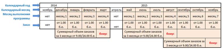 Пример 1. Консультант участвует в программе на протяжении 13 месяцев (с момента размещения первого активного заказа) и ежемесячно с декабря 2014 года размещает заказы на 3.00 б.е.: