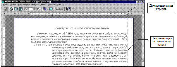 Подпрограмма проверки грамматики просмотрит текст документа и сообщит свои замечания, касающиеся грамматических и пунктуационных ошибок. Можно просмотреть эти ошибки и варианты их исправления и затем внести изменения в текст. Для проверки грамматики в документе используйте команду СервисÞГрамматика. Просмотр документа перед печатью. После того как текст введен, отредактирован, отформатирован и откорректирован, его можно напечатать. Желательно перед печатью документа перейти в режим просмотра. На рис. 23 показан документ в режиме просмотра, чтобы увидеть, как будет выглядеть документ на бумаге. Использование линеек. По умолчанию Word не отображает линеек в режиме просмотра (команда ФайлÞПросмотр). Однако, можно отобразить вертикальную и горизонтальную линейки с помощью команды ВидÞЛинейка. Можно работать с линейками, как и в других режимах просмотра - устанавливать табуляторы, согласовывать отступы, изменять поля. Перемещайте указатель мыши по маркерам полей на линейке до тех пор, пока он не примет вид двунаправленной стрелки. Нажмите левую кнопку мыши и, удерживая её, перемещайте маркер поля вправо или влево на горизонтальной линейке и вверх или вниз на вертикальной. Появляется пунктирная линия, соответствующая расположению полей. Используя эту линию, выровняйте элементы страницы. Использование панели инструментов Просмотр. В режиме просмотра для редактирования документов используется специальная панель инструментов. Принцип действия этой панели такой же, как и у других. Можно использовать кнопки панели для печати документа, одновременного просмотра нескольких страниц, отображения или скрытия линеек, отображения полного экрана без элементов, выхода из режима просмотра и получения справки.