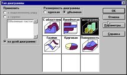 Преобразование диаграммы. Выделив окно Chart (Диаграмма), можно, используя команды меню, преобразовать диаграмму, изменив её вид, надписи, заголовки, оси и пр. Для изменения типа диаграммы можно воспользоваться диалоговым окном Тип диаграммы, которое содержит различные типы диаграмм: С областями, Линейчатая, Гистограмма, Круговая, Поверхность. Диалоговое окно Тип диаграммы представлено на рис. 32.