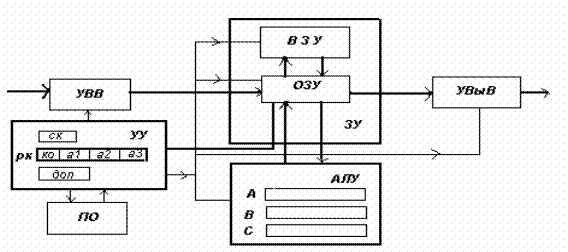 Система адресации предусматривает присвоение каждому размещаемому в оперативном запоминающем устройстве коду - числу или команде - номера (адреса), однозначно определяющего, в каком именно поле памяти расположена эта информация. ЗУ - запоминающие устройства;ОЗУ - оперативное запоминающее устройство; ВЗУ - внешнее запоминающее устройство; УУ - устройство управления (ск - счетчик команд; доп - дешифратор операций; рк -регистр команд; ко - код операции; а1,а2,а3- адреса); АЛУ - арифметико-логическое устройство (А- регистр первого операнда; В- регистр второго операнда; С- сумматор); ПО - пульт оператора; УВВ - устройство ввода информации; УВыВ - устройство вывода информации. Существует много способов адресации и соответствующих методов поиска данных, каждый из которых имеет свои достоинства и недостатки. Не вдаваясь в детали реализации этих методов, необходимо усвоить главное: в подавляющем большинстве современных ЭВМ размещение информации в оперативной памяти и выборка этой информации из памяти всегда осуществляются с использованием адресов. Поскольку команды программы (как и данные) хранятся в оперативной памяти, выполнение программы можно представить как процесс выборки и выполнения команд, хранящихся в полях памяти с последовательными адресами. Выборка команд из памяти осуществляется устройством управления, которое, во-первых, определяет порядок этой выборки, во-вторых, хранит и расшифровывает каждую поступившую команду. Содержащаяся в команде информация используется для выработки наборов сигналов, управляющих взаимодействием устройств в процессе выполнения этой команды. Часть кода команды (код операции) используется для выяснения вида подлежащей выполнению операции, в результате чего арифметическое устройство настраивается на соответствующий вид работы. Оставшаяся (адресная) часть кода команды рассматривается как набор адресов данных, участвующих в операции, и результата. Данные, адреса которых указаны в команде, отыскиваются в оперативном запоминающем устройстве и пересылаются в арифметическое устройство, которое выполняет над ними заданные преобразования. Полученный результат отсылается в оперативное запоминающее устройство и записывается в поле памяти по указанному в команде адресу. Когда выполнение команды закончено, устройство управления формирует адрес следующей команды (в простейшем случае он на единицу больше предыдущего), и процесс повторяется. По мере выполнения программы в оперативном запоминающем устройстве накапливаются результаты вычислений. Они могут быть выведены из этого устройства в заданной форме на соответствующий носитель информации как в процессе работы программы, так и после ее окончания. Преобразование информации, хранящейся в оперативном запоминающем устройстве, из внутренней (принятой в ЭВМ) формы во внешнюю и фиксация ее на выбранном носителе осуществляются устройствами вывода информации. Внешние запоминающие устройства работают значительно медленнее, поскольку в них использованы другие, нежели в оперативном запоминающем устройстве, принципы записи, однако они способны одновременно хранить значительные объемы информации. Эти устройства взаимодействуют с ЭВМ периодически, выполняя роль буфера, который в зависимости от обстоятельств используется либо как приемник, либ