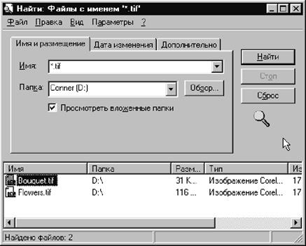 Как видно из рисунка, в качестве критерия поиска в примере поле Имя было введено *.tif. Поэтому результат поиска, представленный в нижней части диалогового окна, содержит список всех файлов типа.tif, размещённых на диске D:.
