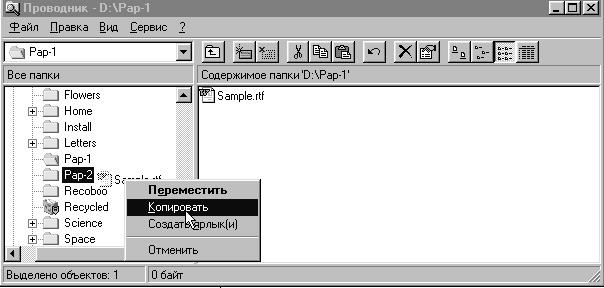 1. Аналогичным образом найдите в левой панели папку PAP-1 (но не щёлкайте на ней); 2. Щёлкните правой кнопкой мыши на имени файла Sample.rtf в правой панели, затем не отпуская кнопку, перетащите файл на папку Деловая в левой панели и отпустите кнопку. Окно программы Проводник примет вид, показанный на рис. 12. 3. Для копирования файла в папку Деловая выберите в появившемся меню опцию Копировать. Копирование и перемещение папок. В принципе это делается так же, как было описано выше для файлов. Надо перетащить нужную папку из правой панели в левую на диск или папку-приёмник. Поэтому обратим внимание лишь на то, каким образом перемещать или копировать папки и файлы, когда, как вам кажется, все они находятся в левой панели диалогового окна программы Проводник. (Пусть, например, надо скопировать или перенести папку П_0 из папки П_1 в папку П_2): 1. Щёлкните на пиктограмме диска, в котором находится предназначенная для копирования или перемещения папка (П_0). Если эта папка находится внутри другой(П_1), то щёлкните на папке (П_1) в левой панели. Список папок, находящихся на диске или внутри выбранной папки (П_1), появится в правой панели (в том числе П_0); 2. Прокрутите левую панель, так чтобы в пределы видимости попало место назначения папки - логический диск или папка (П_2); 3. Скопируйте или переместите выбранную вами папку (П_0), щёлкнув на её пиктограмме и перенеся её из правой панели на выбранный вами логический диск или папку (П_2) в левой панели. Метод “Контекстное меню”. Щёлкнув правой кнопкой мыши на файле, в его контекстном меню выбираете опцию Отправить, которая содержит набор адресов перемещения папок и файлов. Метод «вырезать или копировать и вставить». Иногда предпочтительным оказывается приём, основанный на том, что система позволяет сначала вырезать объект или скопировать его в буфер обмена, а затем, когда найдено место нового размещения объекта, осуществить операцию “Вставка”. Он может быть удобен, например, если вы работаете с окном папки на рабочем столе, а папка-приёмник ещё не открыта либо затруднительно видеть её на экране, так как она находится в другой папке. В этом случае можно воспользоваться соответствующим меню. Когда файлы вырезаются или копируются с использованием опций меню Вырезать, Копировать, они помещаются в буфер обмена и содержатся там до тех пор, пока вы не выберете опцию Вставить и не поместите их в предназначенное место, либо пока в буфере обмена не появится новая информация. Метод предполагает следующую последовательность действий: 1. Откройте папку, например, PAP-1, чтобы увидеть её содержимое; 2. Щёлкните правой кнопкой мыши на файле Sample.rtf, затем выберите опцию Копировать для копирования либо опцию Вырезать для перемещения; 3. Определите место размещения папки, в которую вы хотите скопировать или перенести файл (например, папки PAP-2); 4. Щёлкните правой кнопкой мыши на этой папке и из появившегося меню выберите опцию Вставить. Как видно из примеров, если используется приём щелчка и перенесения, то следует заранее «установить сцену», то есть загодя позаботиться о том, чтобы файлы-источники и место назначения находились в поле видимости. При использовании же описываемой в данном разделе методики это не требуется (благодаря хранению копии источника в буфере). Примечание 1. Опции Вырезать, Копировать или Вставить можно выбрать из меню 