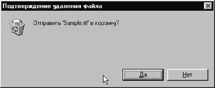Удаление папок и файлов требует большой осторожности, поэтому после отбора файлов для удаления надо тщательно проверить, нет ли среди них таких, которые попали в список по ошибке. Удаление файлов. Есть несколько способов удаления файла: · Выделите файл щелчком левой кнопки мышки, затем нажмите клавишу < Delete > на клавиатуре; · Щёлкните на файле правой кнопкой и из контекстного меню выберите опцию Удалить; · Щёлкните на файле любой кнопкой и перетащите его в Корзину. В первых двух случаях Windows 95 отображает предупреждающее окно, подобное приведенному ниже, для проверки того, действительно ли вы хотите удалить данный объект.