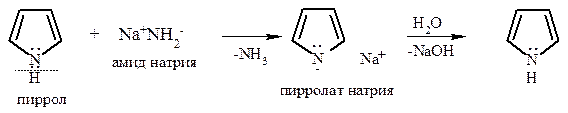 Исследования в области химии пиррола были связаны с деградацией двух важных пигментов: гема – пигмента крови, обеспечивающего процесс дыхания, и хлорофилла – зеленого пигмента растений, ответственного за процесс фотосинтеза. Наряду с соединениями, содержащими одно пиррольное кольцо, в природе широко представлены тетрапиррольные соединения, в которых фрагменты пиррола образуют циклическую ароматическую систему – порфин. Конденсированная система пиррольного и бензольного колец составляет гетероцикл индол. 3.2.1. Кислотные и основные свойства . Пиррол является слабой NH-кислотой (рКа 17,5) и образует соли только со щелочными металлами или с такими сильными основаниями, как гидриды или амиды щелочных металлов, а также при сплавлении (~130ОС) с твердым гидроксидом калия (но не натрия). Образующиеся соли легко гидролизуются водой.