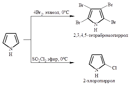 Пиррол настолько легко подвергается галогенированию, что без соблюдения специальных условий образуются стабильные тетразамещенные продукты. В особо мягких условиях и без избытка реагента может быть получен неустойчивый 2-хлоропиррол. При действии на пиррол свободного хлора образуется пентахлорид, структура которого точно не установлена: