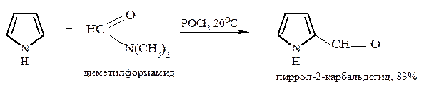 Чем выше температура реакции, тем больше образуется 2,5-дизамещенного продукта. Наиболее общим способом ацилирования и особенно формилирования пирролов является реакция Вильсмайера-Хаака, заключающаяся в действии диметилформамида.