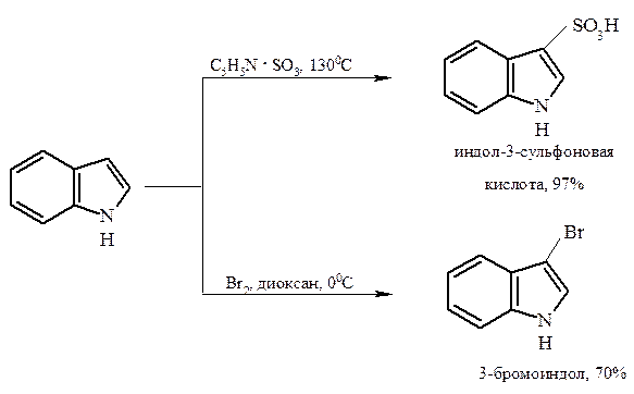 Сульфирование и бромирование индола протекает аналогично пирролу, только электрофильное замещение идет по β -положению.