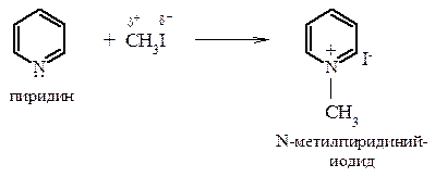 Помимо протона, атом азота может присоединять и другие электрофильные частицы, превращаясь в катион пиридиния. Алкилирование. При взаимодействии с алкирирующими агентами – алкилгалогенидами или алкилсульфатами – атом азота проявляет нуклеофильные свойства и образует ковалентную связь с электрофильным атомом углерода реагента. Получаемые при этом N-алкилпиридиниевые соли сохраняют ароматический характер, так как в результате реакции ароматический секстет электронов не нарушается.