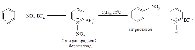 Нитрование. Нитрование по атому азота осуществляется легко при действии оксида азота(V) или нитрониевых солей, например борофторида нитрония NO2+BF4-. Образующийся при этом N-нитропроизводное применяется в качестве мягкого нитрующего реагента некислотного характера, как показано на примере нитрования бензола: