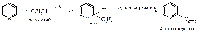 Алкилирование и арилирование. Такие сильные нуклеофильные реагенты, как литийорганические соединения, легко присоединяются к пиридину, образуя соли 1,2-дигидропиридина, которые иногда даже могут быть выделены в индивидуальном состоянии. Возврат к ароматической системе путем отщепления гидрид-иона достигается термически или действием окислителя.