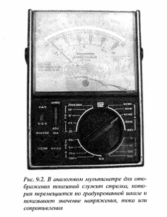 > Цифровые мультиметры имеют цифровой дисплей, как на электронных часах. > Аналоговые мультиметры (раньше их называли тестерами) несколько устарели, но остаются столь же эффективными при измерениях. Для отображения показаний в них используется движение стрелки по градуированной шкале. Образец аналогового мультиметра показан на рис. 9.2.