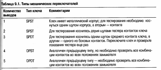 При тестировании исправности переключателей разных типов можно воспользоваться методикой, которая систематизирована в табл. 9.1. Конечно, физическое расположение и функциональное назначение контактов каждого переключателя может несколько отличаться. Так, довольно часто в двухполюсных ключах средний контакт используется как общий провод, и тогда в одном положении замыкателя ток течет с левого контакта на общий провод, а в другом — на общий с правого. Однако не все переключатели имеют подобную конструкцию, и сказать наверняка, как устроен данный ключ, можно только, проведя несколько простых экспериментов.