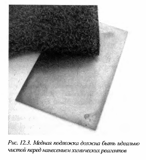 Итак, оказывается не столь уж важно, какой именно технологический процесс исользовать — главное убедиться в том, что медь перед нанесением на нее химических веществ абсолютно чиста. Грязь или жир значительно ухудшают эффективность процесса травления. Можно очистить медь, используя неметаллическую сетчатую губку или специальную плотную ткань для шлифовки (как на рис. 12.3), неплохо также использовать бытовой очиститель или порошок. Всего пару минут работы, и все пятна жира и грязи, да еще и оксидная пленка будут удалены.