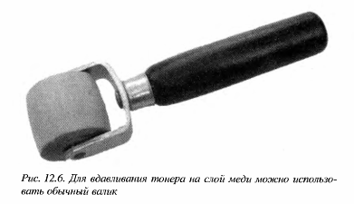 Работа ОТК После переноса тонера на поверхность меди необходимо дать пленке как следует охладиться. Если при прикосновении явно ощущается, что она очень горячая, лучше оставить ее на минуту или две. Затем следует аккуратно снять пленку и выбросить ее — она непригодна к использованию во второй раз. Внимательно осмотрите рисунок на медной подложке. Тонер должен иметь хорошую адгезию (хорошо приклеиться) и как можно меньше (или не иметь вообще) незаполненных участков. Используя увеличительное стекло (3- или 4-кратное), можно неплохо оценить качество переноса изображения. Если видны пробелы или незаполненные участки, то их следует аккуратно зарисовать тонким маркером с резистивными чернилами. Такие маркеры иногда можно найти в магазинах электроники; в них используются специальные чернила, которые, как и фоторезист, не растворяются в процессе травления. Может оказаться полезным использовать для переноса тонера на медь деревянный или резиновый валик. Давление валика помогает эффективнее нанести тонер на гладкую металлическую подложку. Хороших результатов можно добиться при помощи валика для обоев, такого, как изображен на рис. 12.6. Однако нужно быть внимательным, чтобы вдавить тонер в поверхность платы исключительно вращательным движением валика, а не его проскальзыванием, иначе рисунок на поверхности платы может повредиться.