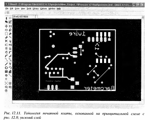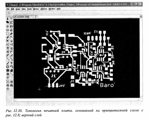 Принципиальная схема, нарисованная в программе Eagle Light от CadSoft, показана на рис. 12.8 (Примечание: все схемы и проектные чертежи в этой главе относятся к проекту электронного барометра, разработанного Ф. Глэдстоуном.) Итак, хотя на рисунке показан целый проект, пока что для нас это чересчур большая схема. Давайте сперва немного уменьшим масштаб и рассмотрим внимательнее участок схемы, изображенный на рис. 12.9. После проверки схемы на ошибки проектирования можно начинать процесс трассировки платы, т.е. разработки ее топологии; именно топология является тем самым исходным шаблоном, по которому позднее изготавливается печатная плата.