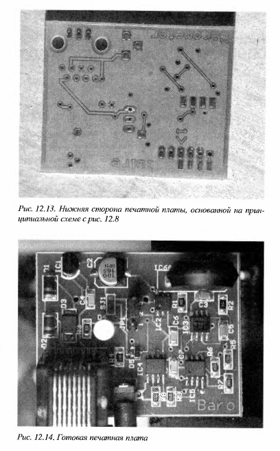 Нижняя сторона той же платы показана на рис. 12.13; она полностью соответствует топологии с рис. 12.11, за исключением зеркальной ориентации. Ну, и напоследок — полностью собранная печатная плата со всеми радиоэлементами показана на рис. 12.14.