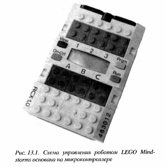 Типичный пример деятельности микроконтроллера показан в схеме управления роботом из набора LEGO Mindstorms. Желтый кирпичик, изображенный на рис. 13.1, содержит миниатюрный кристалл микроконтроллера, который может выводить информацию на жидкокристаллический индикатор (ЖКИ), реагировать на переключение кнопок, другие воздействия и одновременно управлять сразу тремя независимыми моторчиками. Как и все остальные микроконтроллеры, встроенное в LEGO Mindstorms устройство также необходимо запрограммировать. Это делается с помощью специальных команд. Сначала их нужно написать на персональном компьютере, а затем передать на LEGO Mindstorms по инфракрасному порту (в отличие от общепринятого способа передачи по последовательному или USB-порту). После пересылки команд в микроконтроллер они остаются в энергонезависимой памяти устройства до тех пор, пока не будут заменены следующей программой. Миникомпьютер LEGO Mindstorms представляет собой яркий пример способности микроконтроллера выполнять самые различные функции путем замены одного лишь программного обеспечения. Достаточно изменить в программе всего только несколько строк, и робот LEGO Mindstorms сможет выполнять следующие функции.