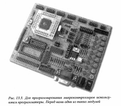 Микроконтроллер - персональному компьютеру: "Пожалуйста, помоги!" При покупке микроконтроллера без встроенного языкового интерпретатора нужно сразу позаботиться о покупке (или самостоятельном изготовлении) специального модуля для программирования. Это устройство (оно называется программатором) обеспечивает физическую связь между персональным компьютером и микроконтроллером. Наиболее широко распространенные модули для программирования обычно можно использовать сразу с несколькими близкими моделями одного производителя, нужно только проверить эту опцию. Пожалуй, мало смысла покупать устройство, с помощью которого можно программировать только одну модель микроконтроллера. Цена на программаторы также может составлять от нескольких до сотен долларов. Однако можно собрать несложный программатор и самому, хотя большинство начинающих специалистов предпочитают использовать готовые устройства, чтобы сэкономить время и силы. Лучше испытать силы на конструировании программатора уже после приобретения пусть даже небольшого опыта по работе с программируемыми микроконтроллерами. На рис. 13.3 показан типичный коммерческий модуль для программирования. Этот конкретный программатор имеет на плате несколько кнопок и светодиодов (на фотографии — справа), которые облегчают контроль над разработкой программного продукта. (Судя по всему, на фотографин изображен не просто программатор, а отладочный модуль (типа STK). С его помощью можно не только стереть или запрограммировать микроконтроллер, но и визуально оценить состояния портов ввода-вывода, легко подключить к процессору периферийные устройства, используя многочисленные разъемы и перемычки. Кроме того, на плате модуля уже собраны элементы питающей цепи со всеми необходимыми фильтрами и защитными цепями. — Примеч. ред.) В принципе, для программирования микроконтроллера дополнительные функции, которые обеспечивает данный модуль, совсем не обязательны, но их всегда приятно иметь под рукой, да и они не так сильно влияют на цену, как может показаться. Нужно вставить микросхему в разъем на модуле и подключить плату к компьютеру и источнику питания. Многие, хотя и не все, программаторы и отладочные наборы включают в комплект как минимум один редактор, в котором удобно писать программы. Если же редактор отсутствует, придется поискать его самостоятельно.