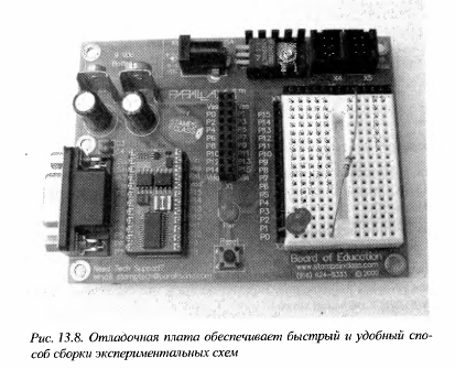 "Все включено", или Весь мир на кристалле Как и BASIC Stamp, микроконтроллеры OOPic имеют несколько разных версий. Можно купить его как в составе отладочного модуля (рис. 13.6), так и отдельно, в виде 24-выводной платы, как в Basic Stamp 2. На отладочной плате присутствует пищалка, несколько переключателей и светодиодов, которые работают в качестве индикаторов, а также море разных разъемов и контактов для подключения периферийных компонентов.